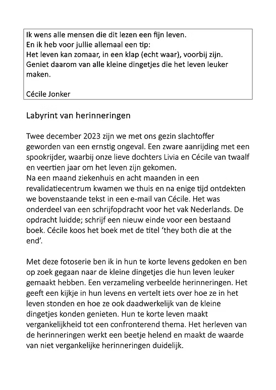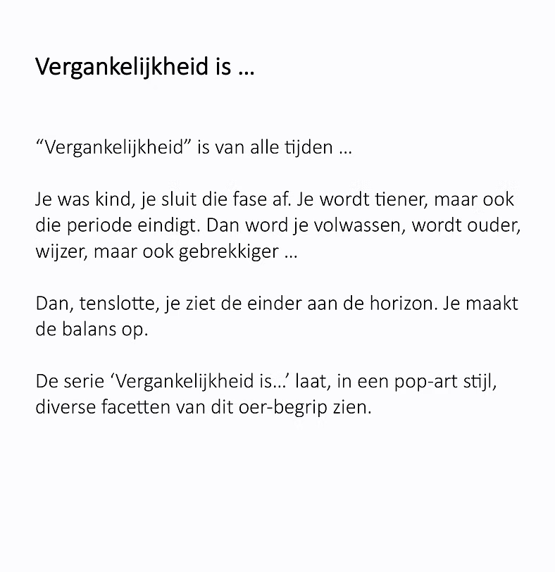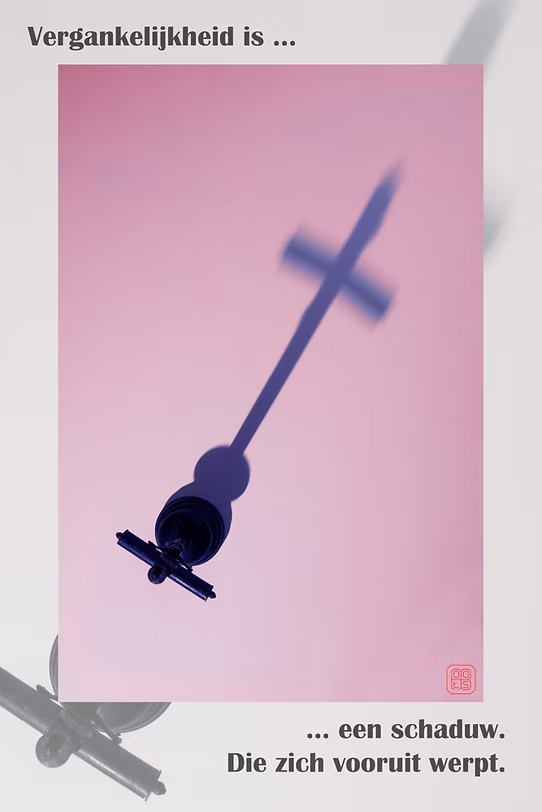 Alle herinneringen draag ik onzichtbaar voor anderen met me mee. Van begin tot eind, van afkomst tot ouderdom. Blije en verdrietige herinneringen wisselen elkaar af. Er zijn herinneringen die scherp op mijn netvlies staan, aan het vervagen of vervormd zijn. Ze zijn me dierbaar. Ik vervolg mijn weg en koester mijn vergankelijkheid tot mijn dood. Dan zal slechts een symbool mijn aardse bestaan nog een tijdje markeren.